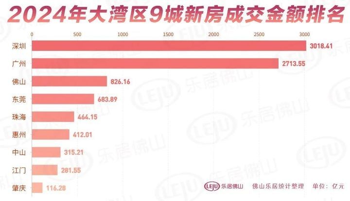 而在卖房实绩上,2024年深圳新房成交金额高达3018亿元,高居湾区之首;广州2713亿元紧随其后,而佛山则以826.16亿元跻身第三位,成绩斐然。