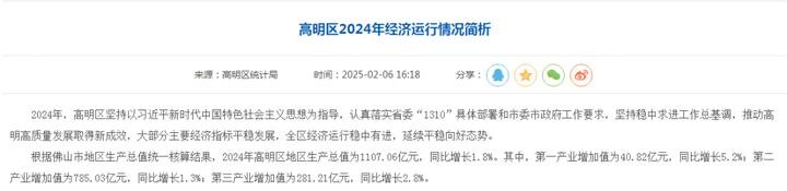 截至目前,佛山五区中,仅南海、高明区公布了GDP数据,而顺德区公布了2024年经济运行简况,但未公布GDP数据。