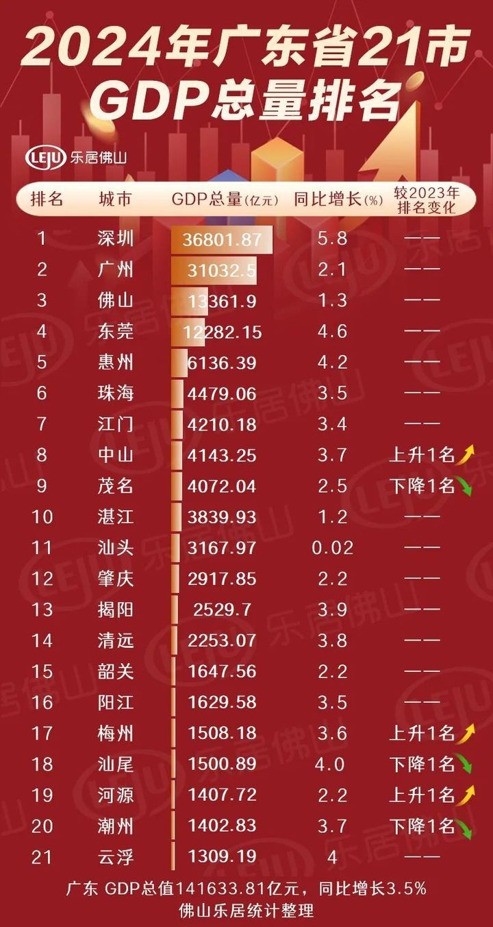佛山和东莞分别以13361.9亿元和12282.15亿元的GDP总量位居第三和第四;对比2023年的排名,有3城排名上升1位:中山、梅州、河源;3城排名下降1位:茂名、汕尾、潮州。