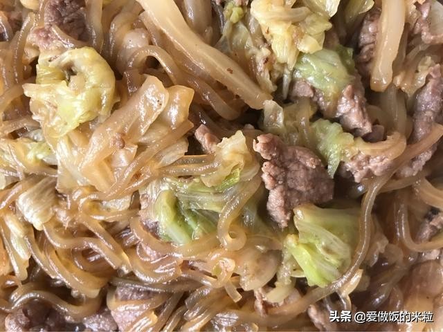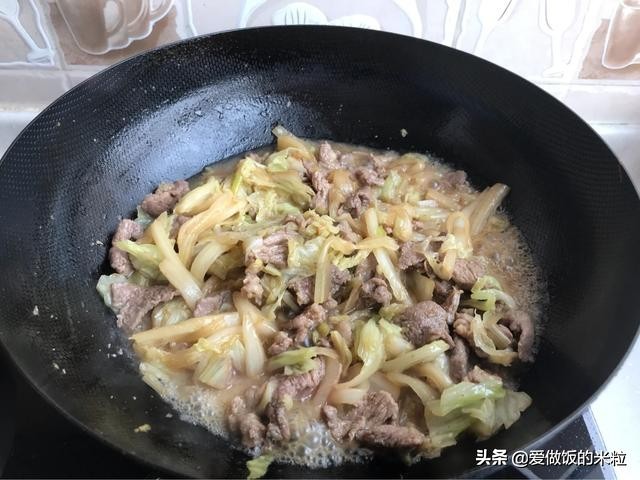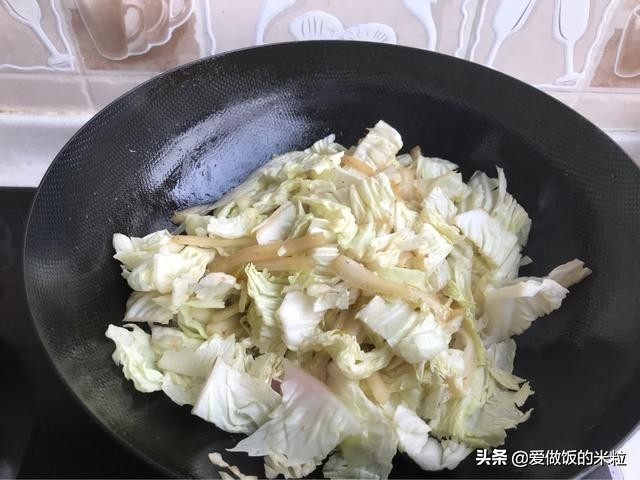 3、先放盐,让白菜把盐分充分吸收,再放肉片和粉条,因为肉片用调料腌过了,有盐分,而粉条特别容易吸收盐分,会很咸。