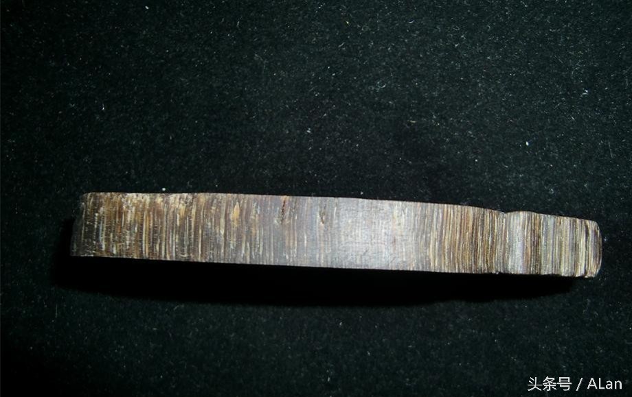 10、犀牛角区分其它牛角的另一个显著特征,就是犀牛角(亚犀非犀都具有)的纵向纹路永远是直的且相互平行,即便是因年代的久远而出现开裂,也不会出现如其它牛角般那样的交叉网路。犀牛角的横断面,虽有年轮,但因纵向纤维纹路是相互平行的结构,所以反映于横截面上的现象是:对于亚犀被称做“鱼子纹”;对于非犀被称做“甘蔗纹”,行内人士都统称叫“鱼子纹”。而其它牛角则没有这种特征。