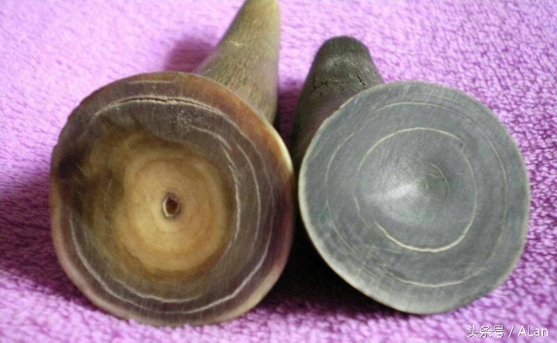 3、看角髓:水牛角在横剖面可见围绕中心层叠的白色圈状角髓(角朊层),亚洲犀角没有,非洲犀角只在外围有一圈阔边的角髓,没有层层套叠。