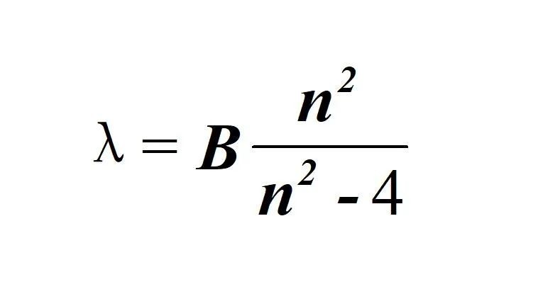 现在问题就来了,氢的可见光谱中,这四条暗线所对应的波长之间,是否存在某种联系呢?许多科学家认为,这些数字的背后一定对应着某种未知的物理规律,但没有人可以得出结论。于是巴尔末决定,管他的背后有什么物理规律,先把这四个数字之间的数学规律给研究出来。可能是上班也确实没啥事儿,巴尔末就天天在那算。天知道巴尔末到底尝试了多少个公式,但最后他还真就搞出来了。1885年,巴尔末提出,氢的可见光谱中的四条波长,可以用一个公式表达出来,这个公式为λ等于常数B乘以n的平方除以(n方-4)。这个常数B是多少不重要,我也记不住,总之就是,当n=3,4,5,6时,就分别对应以上四个数字。