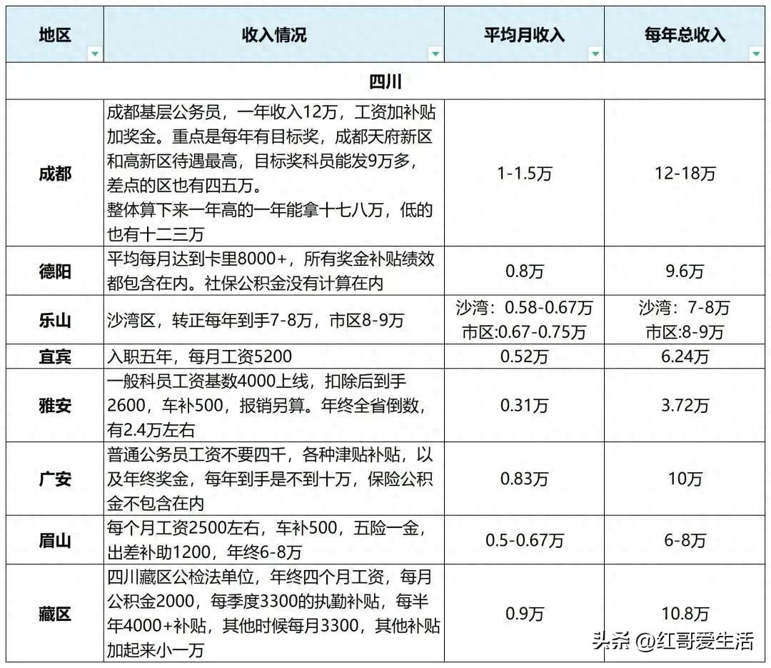 成都基层公务员,一年收入12w,工资加补贴和奖金。工资一个月3k,车补科员每月500,还有电话补助和出差补助,乡镇公务员有下乡补助500—1000+不等,每月公积金科员大概单边1000上下,好的地方科员有1500左右的,差的也有八九百,重点在每年的目标奖,成都天府新区高新区这种最好的区,目标奖科员能发到9万多,差点的区,也有四五万,算下来一年高的能拿十七八万,低的也有十二三万。