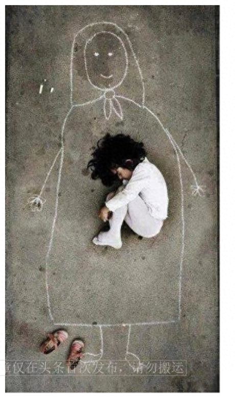 这张照片中,一个孩子在地上用粉笔画出他的母亲的轮廓,然后依偎在画像旁入睡。这无声的表达充满了孩子对母亲的深情。