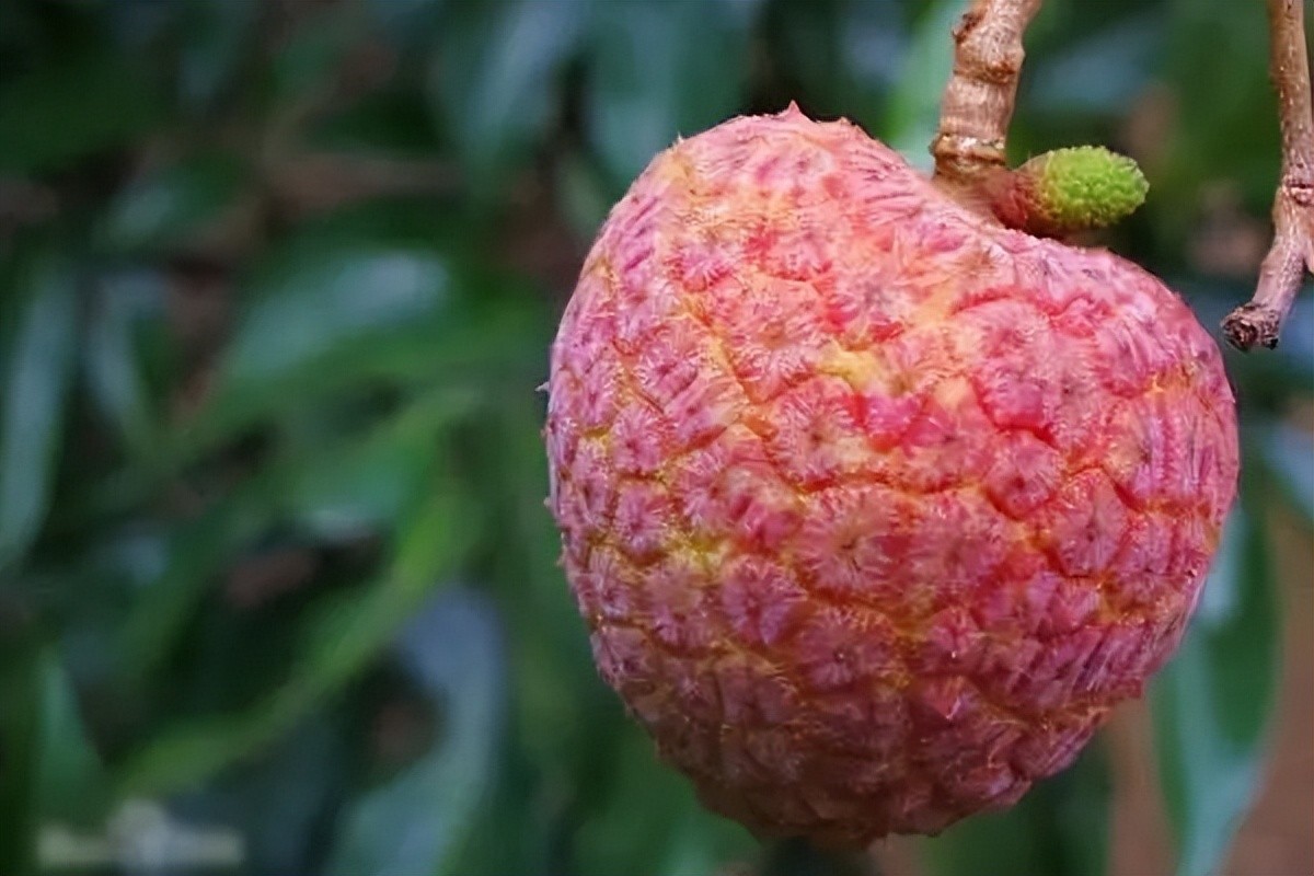 成熟挂绿荔枝,果实近圆形,果顶浑圆,果肩一边微耸,一边稍凹,谓之“龙头凤尾”;果梗较粗,一般情况下带一小果。