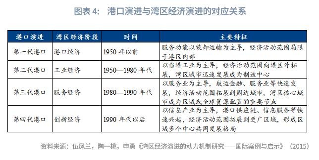 “湾区经济”起源于港口经济,港口可以给货物流动带来低廉的运输成本和丰富的物流资源,是带动湾区经济起步的最初动力;壮大于工业经济,港口经济活动范围向港区外不断拓展的同时,湾区城市也迅速发展成为制造中心;成熟于服务业经济,湾区城市由原来的制造业中心向生产性服务业如金融中心、贸易中心、信息中心、管理中心等转变,湾区核心城市作为资源配置的重要节点,在区域或全球经济中的地位日益显著;升华于创新型经济,湾区城市抓住新兴产业发展的历史机遇,加快推进以网络服务、创新金融、供应链管理以及商业模式创新等为主要内容的创新经济发展,抢占了产业发展的制高点。