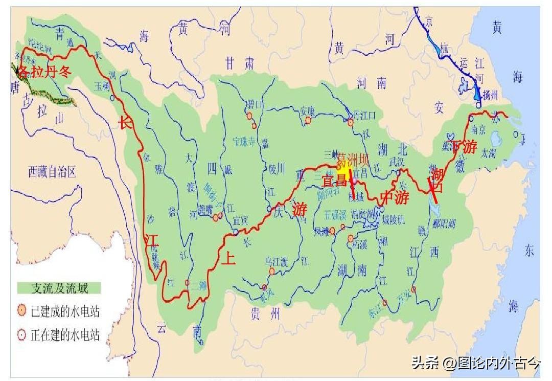上游:长江源在青藏高原腹地昆仑山脉和唐古拉山脉之间。长江三源是北源楚玛尔河、正源沱沱河、南源当曲。从源头到宜昌段为上游,长4504千米,流域面积100万平方千米,其中直门达至宜宾称金沙江,长3464千米。宜宾至宜昌河段习称川江,长1040千米。