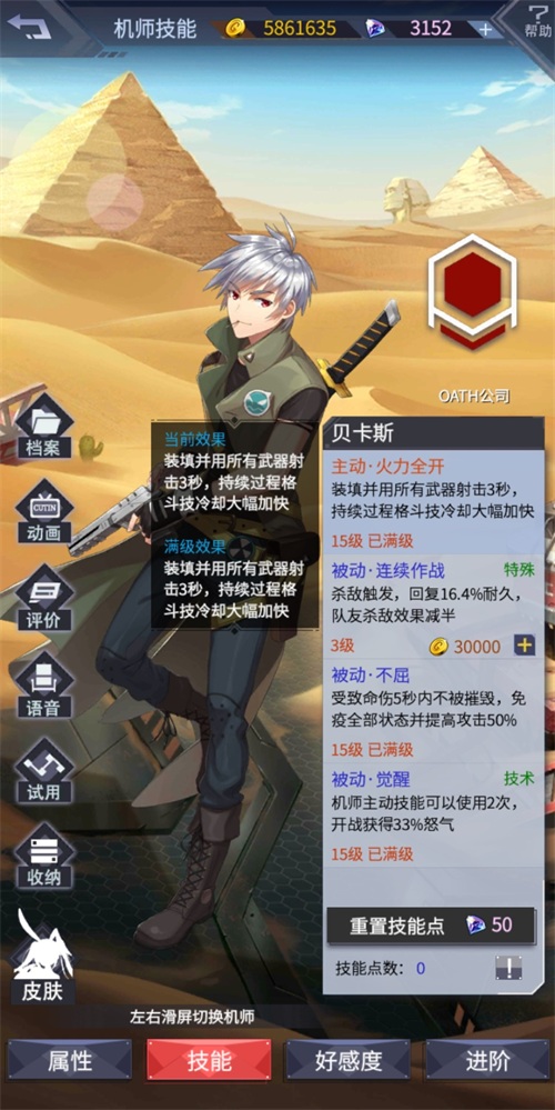 被动-王牌机师:切换武器或动作衔接变得更快,全属性增加20%。(15级)