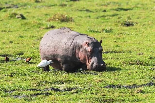 河马是淡水物种中的最大型杂食性哺乳类动物,体型巨大,体长4米,肩高1.5米,体重约3吨,有一个粗硕的头和一张特别大的嘴,比陆地上任何一种动物的嘴都大,并且足可以张开呈90度角,就是这张十分夸张的嘴可以产生1800磅的咬力,约等于816公斤。河马平时较安静,一旦发起脾气来,常常打架,它们各自用自己锋利的牙齿去刺伤对方厚厚的皮肤。有时在河里发起怒来,它敢顶翻小船,把船咬成两段。