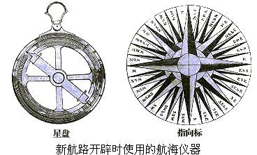 b.航海技术的提高 (罗盘针和计算纬度的星盘等的应用)