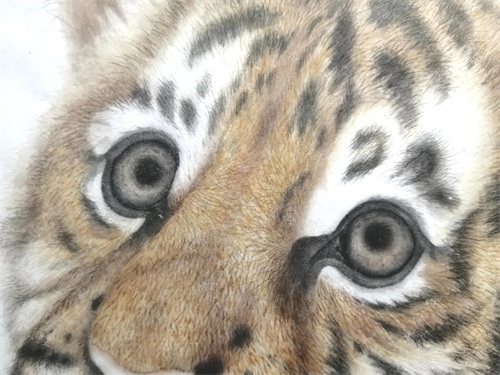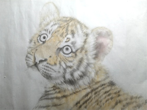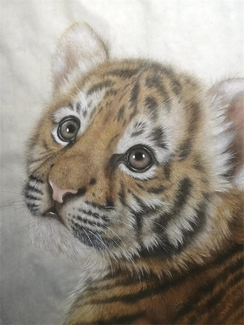 白描部位继续用赭墨丝毛,黑色斑纹用淡墨偏深再次丝毛调整,色块整齐的,色块呆板的都要用墨线破掉,边缘丝的长一点,要长短不一。眼珠,瞳孔中墨偏淡继续加染。