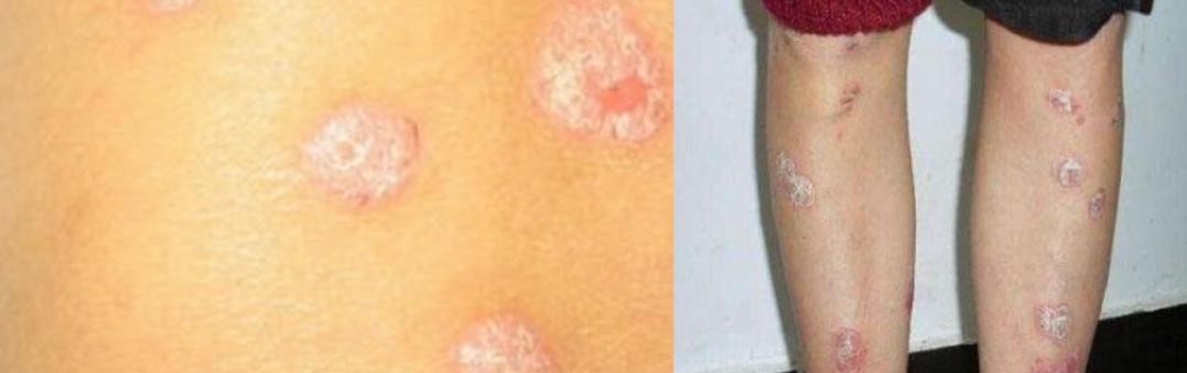 症状:我们常说的牛皮癣,又叫银屑病。一开始皮损为红色丘疹或斑丘疹,逐渐扩展成为境界清楚的红色斑块,可呈多种形态(如点滴状、斑块状、钱币状、地图状、蛎壳状等),上覆厚层银白色鳞屑。