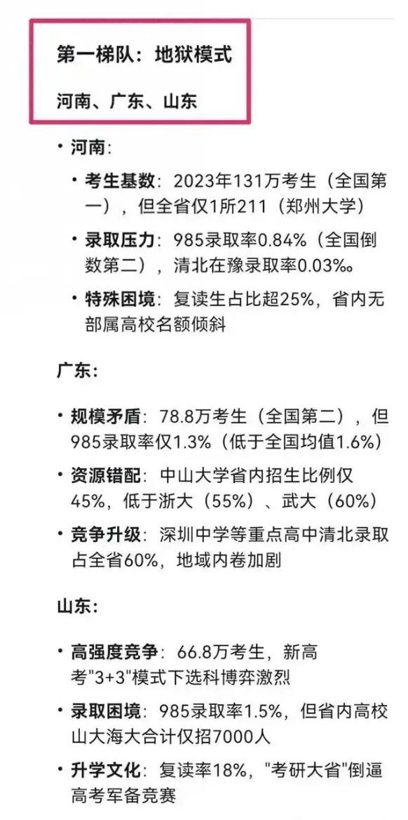 位列高考难度排名第一梯队“地狱模式”的有三个省份,分别是:河南省、广东省、山东省。河南省的高考难度在地狱模式似乎在意料之中,河南省常年高考人数登顶,复读比例更是超过四分之一,然而对比如此庞大的考生基数和复读比例,河南省本省的教育资源却非常稀缺,全省仅有一所211郑州大学,让河南考生压力更甚。