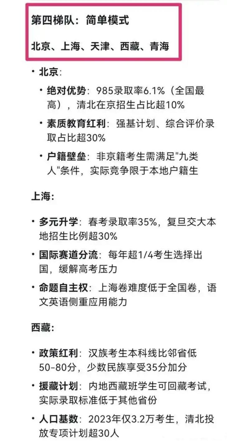 最后一个梯队是简单模式,分别是北京、上海、天津、西藏以及青海,北京、上海、天津这些地区在高考的难易程度上都有自己的绝对优势和教育红利,再加上户籍壁垒的加持,避免了其陷入高考内卷的纷争之中。
