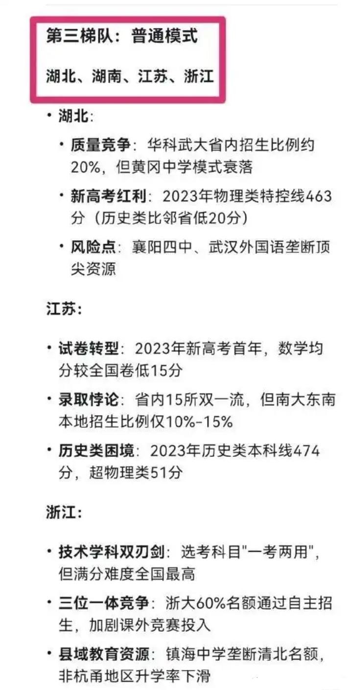 位于第三梯队的普通模式依次是:湖北、湖南、江苏以及浙江,湖北省的黄冈模式逐渐衰落,但好在新高考特控线的存在,得以保证了湖北省的考生不至于陷入更大的困境。