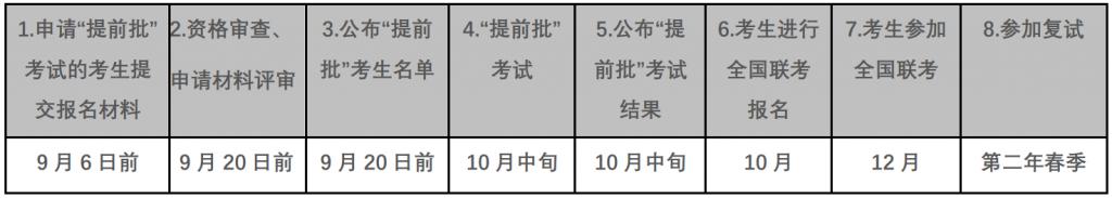 符合报考条件的考生可申请参加 " 提前批 " 考试(不接受报考专项计划的考生申请)。" 提前批 " 考试将安排在全国联考之前,考试成绩仅在该招生年度有效,考试方式为面试 + 笔试。