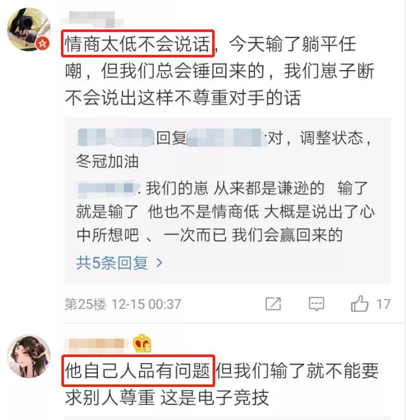 在这条超话下面,也有很多QG的粉丝表示赞同,他们认为老帅的情商太低,QG的选手就不会说出这么不尊重对手的话,甚至有的粉丝还觉得老帅人品有问题。有一个粉丝还说道:老帅混得了一时混不了一世,冬冠期待FMVP的表现。