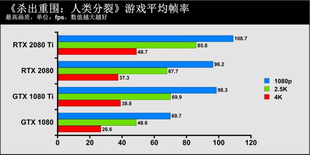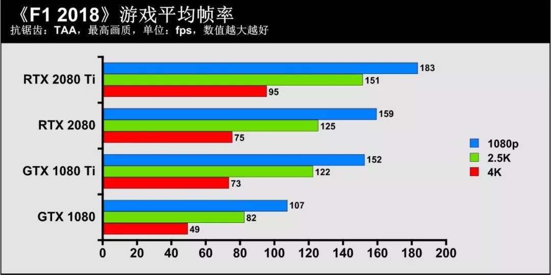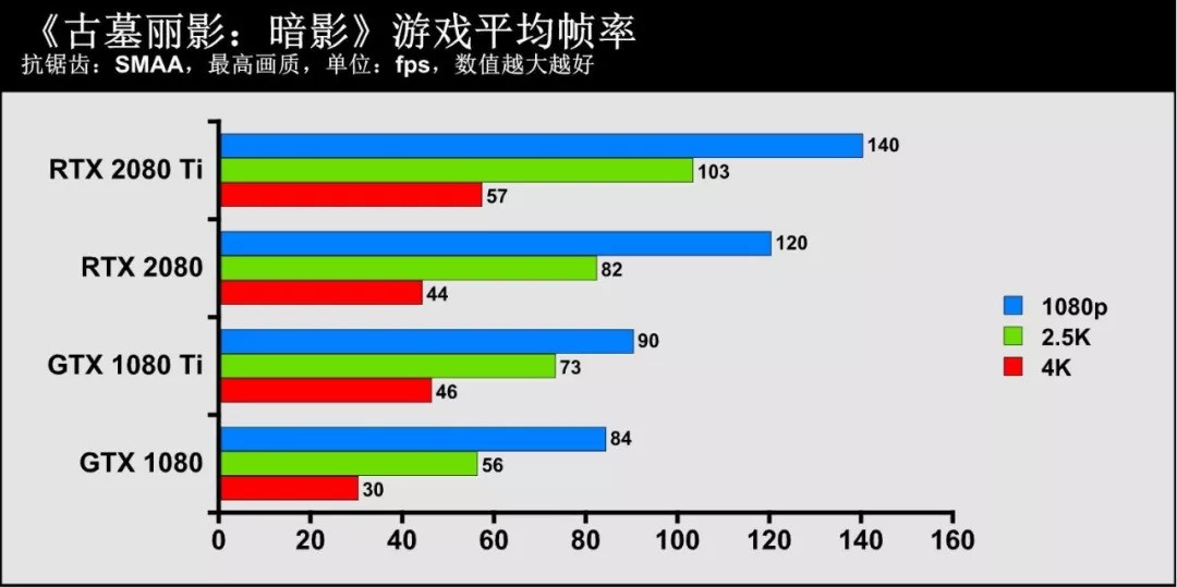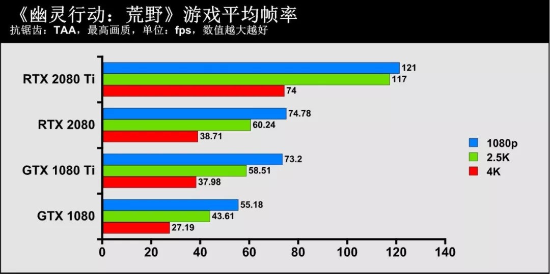 同样的情况也出现在RTX 2080 Ti与GTX 1080 Ti的测试对比成绩中,除个别游戏本身的因素影响导致RTX 2080 Ti的性能增长不足10%之外,普遍状况下游戏性能的增长幅度都超过了20%,甚至在《幽灵行动:荒野》这款游戏中,RTX 2080 Ti相比GTX 1080 Ti性能近乎翻倍!