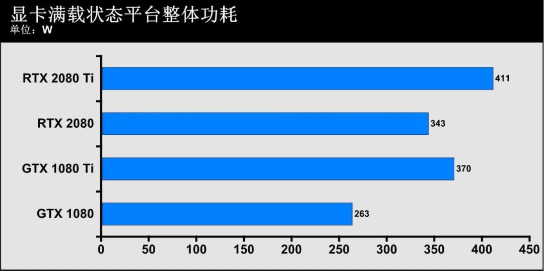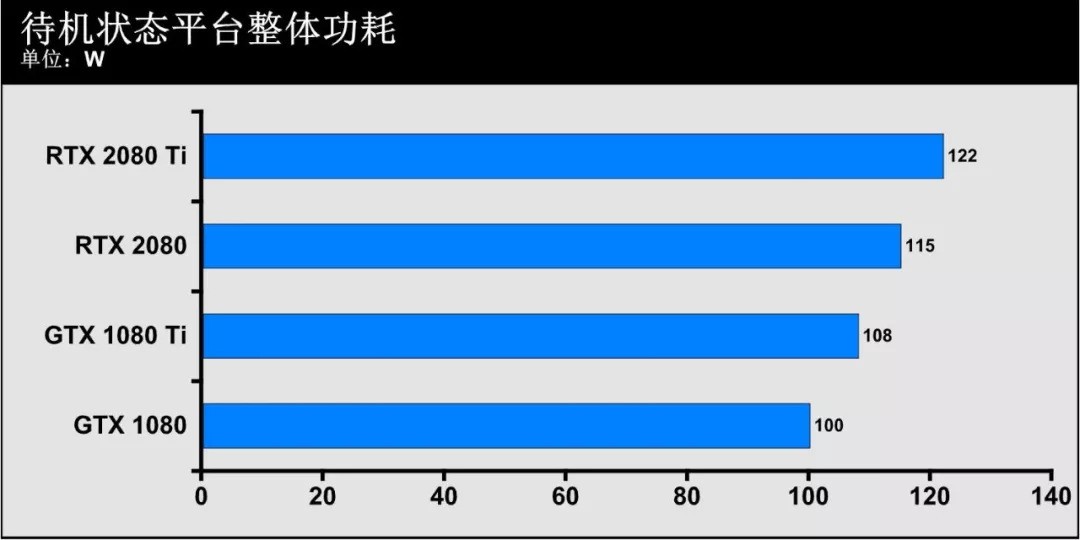 由于频率、流处理器数量、RT Core、Tensor Core等参数指标都有明显的增长或增加,因此也导致了RTX显卡相比上一代GTX显卡在功耗上有了一定的增加。从测试结果来看,RTX 2080 Ti和RTX 2080在待机状态下相比GTX 1080 Ti和GTX 1080有10W~15W左右的增加。而在满载状态下,RTX 2080相比GTX 1080功耗大约增加了80W左右,RTX 2080 Ti相比GTX 1080 Ti则增加了40W左右。