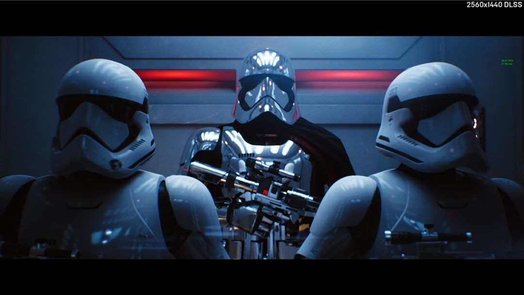 从实际的体验效果来看,在RTX 2080 Ti或RTX 2080下,游戏演示Demo中星战武士的黑色或白色盔甲的表面呈现出了与普通模式下截然不同的光影效果,特别是盔甲表面对环境物体的反射效果随着物体或灯光位置的变化进行着实时的演算变换,从而呈现出了更为真实和生动的表面光影效果。这与之前物体表面光影效果算法相对单一时得到的画质有着明显的差异,更真实,也更接近于电影级的效果。这也让我们对RTX显卡将会引导3D游戏的再一次革新充满了信心,也更加期待在未来《古墓丽影:暗影》、《战地5》等游戏中充分享受到RayTracing所带来的影院级游戏画质。