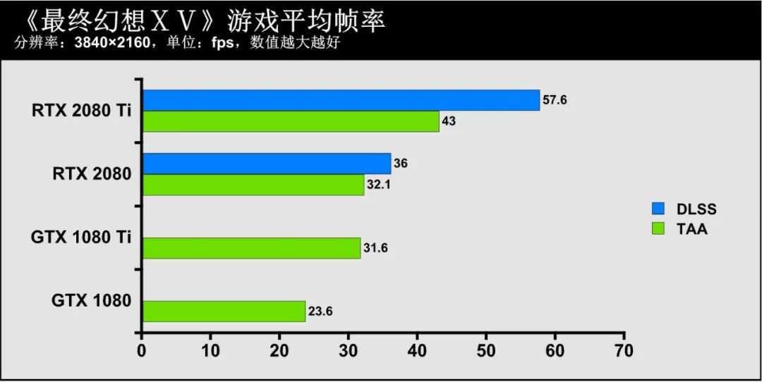从测试成绩可以直观地看到,DLSS的确给了玩家足够的惊喜。在《最终幻想ⅩⅤ》中开启DLSS之后,RTX 2080相比同画质设置,但运行在TAA抗锯齿模式下的GTX 1080帧率提升了50%以上!而在《质量效应2:渗透者》中,性能的增幅更是超过了100%。同样,对于RTX 2080 Ti来说,在开启DLSS之后,两款游戏中帧率的提升幅度都接近80%,可以说是完全在意料之外!同样,在同比的条件下,RTX 2080在开启/关闭DLSS时,游戏帧率约有15%~30%的变化,而RTX 2080 Ti更为明显,关闭DLSS之后,游戏帧率大约下降了35%~40%左右。