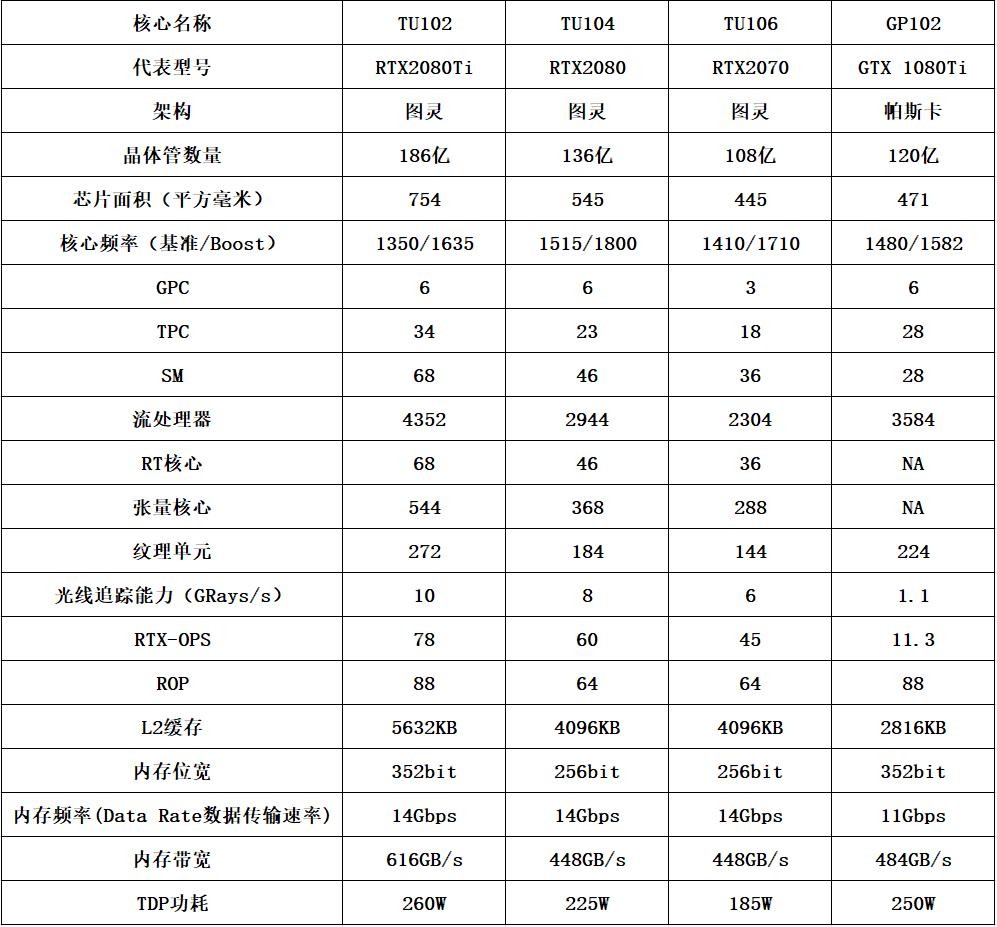NVIDIA在8月底正式发布的GeForce RTX显卡产品中,主要提到了三款产品,分别是基于TU102核心的目前最高端的旗舰产品GeForce RTX 2080 Ti、基于TU104核心的高端产品RTX 2080以及基于TU106核心的中高端产品RTX 2070。很明显,三款产品也是分别和前一代的GTX 1080 Ti、GTX 1080以及GTX 1070相对应。