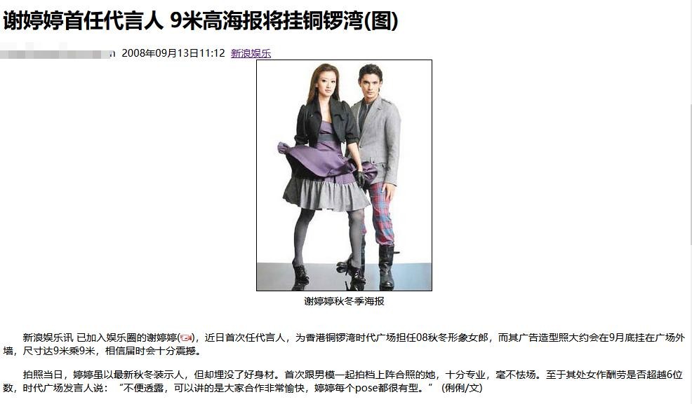 《新浪娱乐》|谢婷婷首任代言人 9米高海报将挂铜锣湾(图)