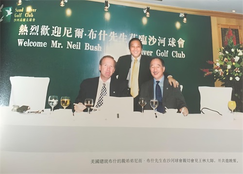 而这张王林与美国总统布什胞弟等的合影中,王林还特地在下面备注了一行字:布什先生在沙河球会亲切会见王林,并共进晚餐。