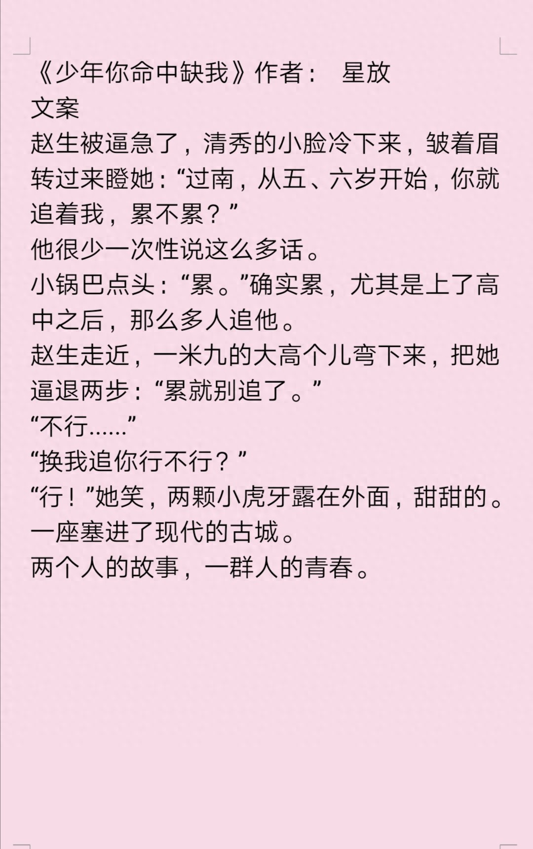 哈喽,今天要给大家带来的作者是星放,她的文都很温馨很温馨,看了她的文我就想找一个青梅竹马的小哥哥。而且她的文笔也还不错,超级甜的文,值得一看哦!好了,我们直接上文叭!《少年你命中缺我》~~~~~~