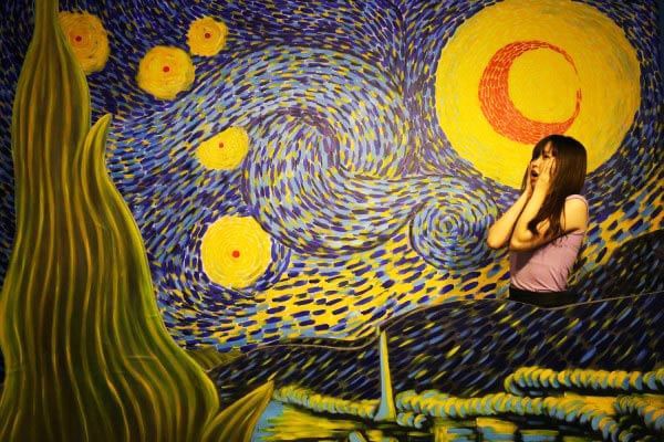 进入场馆后首先看到的就是梵高乐园,这些梵高画都是3D立体的,踱步其中,感觉就像是走进了梵高的画中一样。再往里走就能看到许多新奇有趣的3D艺术了,有大小房间、重力逆转室、乞丐实验室、错觉椅子……每一个都十分有趣。许多人进来后的第一反应都是每个场景都尝试一下,然后请自己的朋友站在最佳拍摄点为自己拍照,顷刻之间,一幅“人在画中”的3D艺术图就呈现出来了!