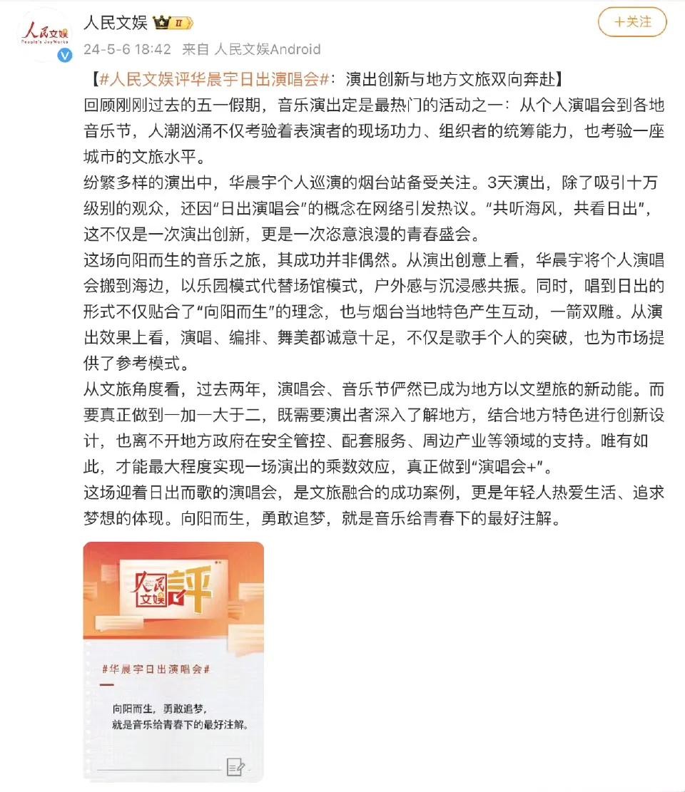 前一阵华晨宇的“日出场”演唱会,被人民文娱评价为“演出创新与地方文旅的双向奔赴,不仅是歌手个人的突破,也为市场提供了参考模式,是文旅融合的成功案例”,新华社、中国日报ChinaDaily、中国网财经、第一财经日报等多家主流媒体均深度报道了“日出场”演唱会,分析其巨大的社会与经济效益,据烟台官方统计,华晨宇烟台站日出场演唱会连开三天,吸引了全国各地约13万歌迷相聚烟台市牟平区,实现旅游收入约1.6亿元,此外,“日出场”演唱会还成为了考公考编的热点话题,以及大中小学教学的优质素材,《向阳而生》这首歌更是成为了各地文旅宣传当地大好河山的必备bgm,经济效益与社会效益双丰收。