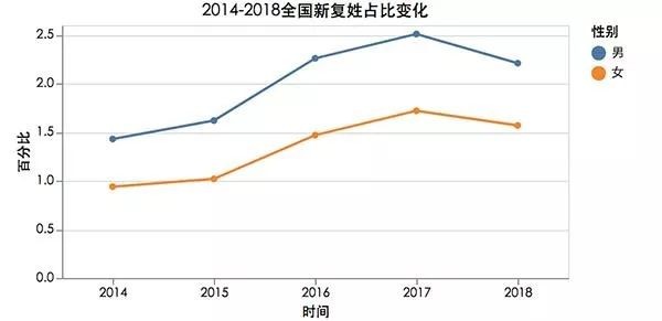 2014年-2018年全国新复姓占比变化 来源:2019姓名全景报告