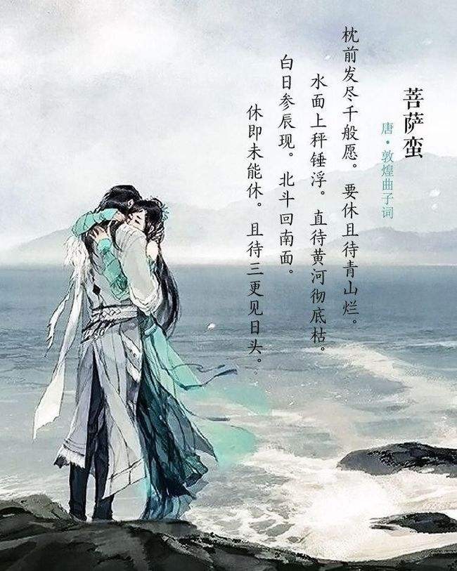 枕前发尽千般愿,要休且待青山烂。水面上秤锤浮,直待黄河彻底枯。 白日参辰见,北斗回南面。休即未能休,且待三更见日头。