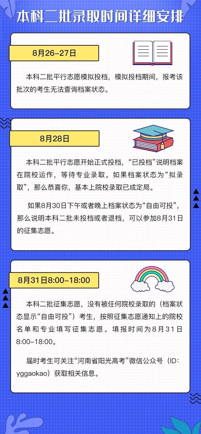 8月26日,河南省2025年高招本科二批开始录取,录取时间为8月26日-8月30日,本批次实行平行志愿投档模式,正式投档前将先进行数轮模拟投档,8月31日8:00-18:00,本科二批征集志愿哪些院校参与本次录取工作?本次录取时间安排具体是怎样的?一起往下看!