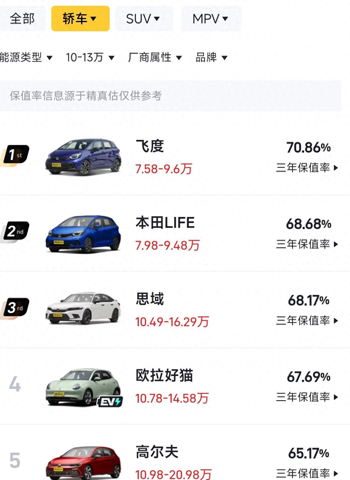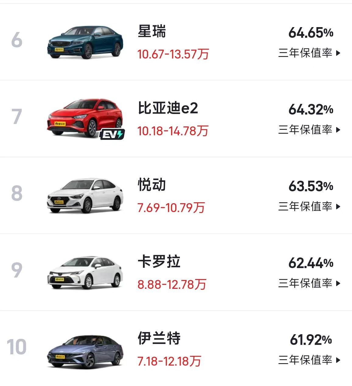 十万级别轿车保值率排行榜TOP10,新能源仅两款,前三名惹争议