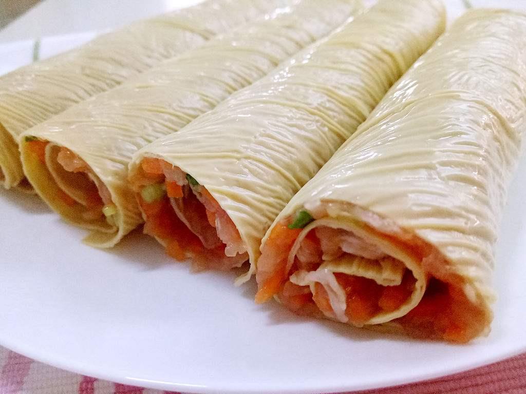 3、豆油皮鲜肉卷:豆油皮清洗干净后加入温水中泡发沥干待用;准备好肉馅加入胡萝卜、小葱剁碎后加入蛋清、香油、食盐、胡椒粉等搅拌均匀待用;处理干净的豆油皮切成均匀的方块状,然后将调制好的肉馅涂抹在豆皮上,然后将豆油皮卷起来放置在盘中;蒸锅中加入适量的清水,然后将豆油皮肉卷加入隔水蒸10分钟后即可出锅切片食用。