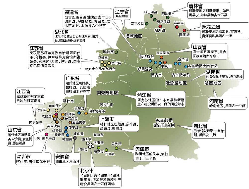 对口援疆即国家以灾区重建的模式来扶持新疆,要求全国19省市对口支援新疆。各省市需建立起人才、技术、管理、资金等方面援助新疆的有效机制,优先保障和改善民生,并且要下大力气帮助新疆各族群众解决就业、教育、住房等基本问题,同时支持新疆相关特色产业的发展。提高新疆自身的“造血”功能。