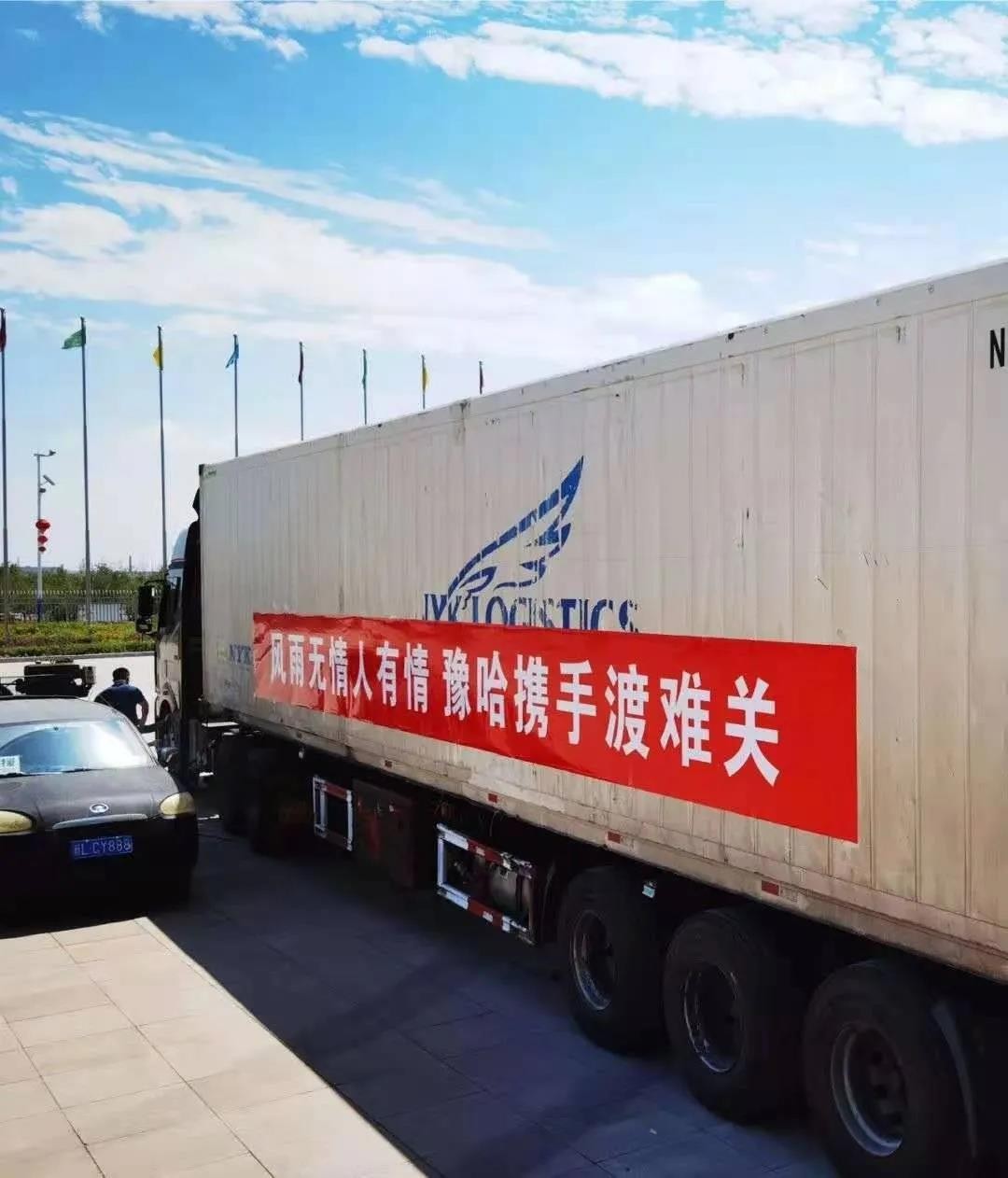 车厢上贴着“风雨无情人有情,豫哈携手渡难关”的横幅格外醒目,车里装着价值19万多元共2459套件夏秋季运动服,即将开拔运往河南;200条以新疆棉为材质的褥子发往河南。