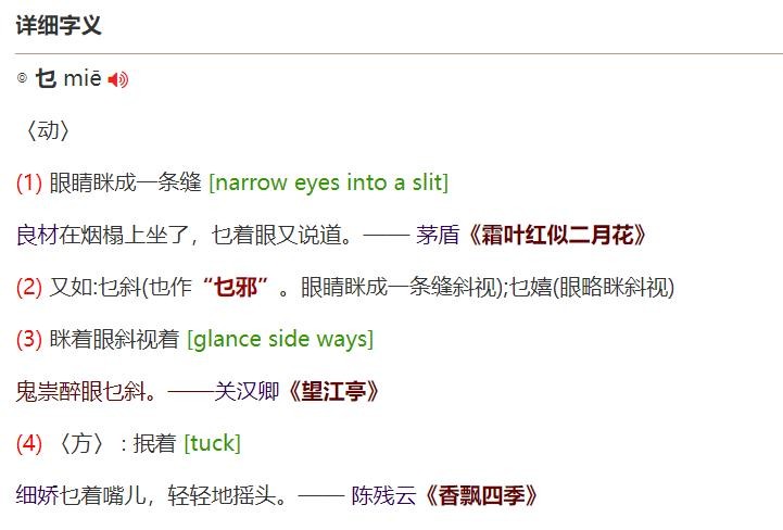这也正符合“乜”字的本义。历代的汉字字典中,对“乜”字的解释几乎都与这层意思相去不远。