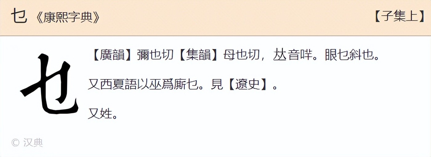 通读前文对“乜”字的讲解后,再来理解《康熙字典》的解释,就可以发现它们内容是一致互补的。这更加巩固了我们对“乜”字的认识。