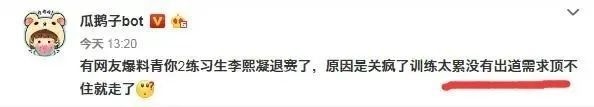 《青春有你2》首播时间为3月12日,而早在2月底节目未播出前就有人爆料李熙凝不能忍受辛苦第一个退赛。