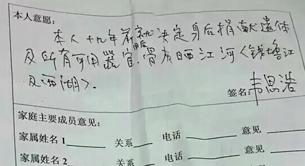 在众多的汇款凭证中,还有一张不起眼的白色纸条,这是是老人早年间瞒着家人,亲自签署的一份协议,大致意思是这样的,“本人自愿于死后滦县可用器官,骨灰撒江河。”