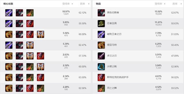 实际上就是装备契合度,装备契合度顾名思义,指的是装备与这名英雄的特性是否相符,如老青龙刀和鳄鱼,三相之于贾克斯,羊刀与剑圣。我们首先看一下鳄鱼的核心装备,可以看出当前版本,破败和黑切是首要选择。