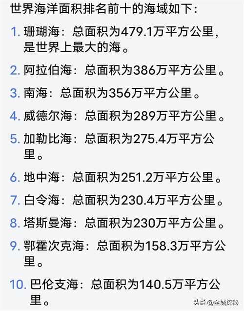 第三大海估计会让很多人意外,是我们非常熟悉的南海,它的面积也有356万平方公里,比地中海大了40%,接下来还有面积289万平方公里的威德尔海,以及面积达到275.4万平方公里的加勒比海,等等。