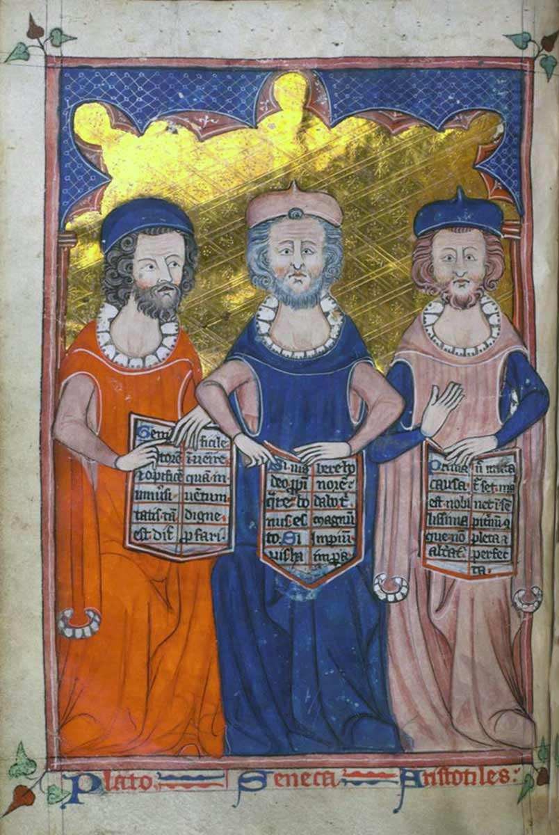 中世纪手稿插图中的柏拉图、塞内加和亚里士多德,约 1325-1335 年