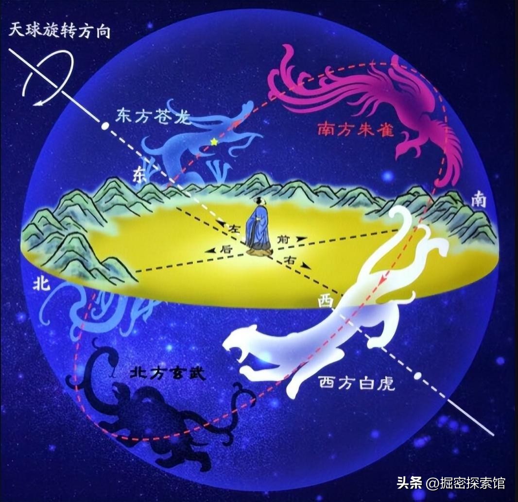 但古人不一样,他们是面向南方看方向的,所以就有了“左青龙,右白虎,前朱雀,后玄武”的说法。